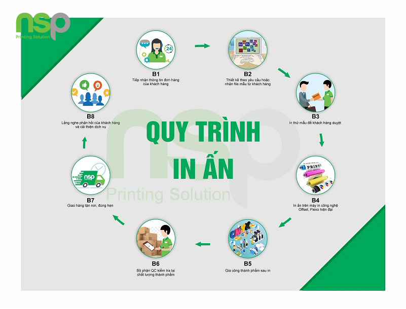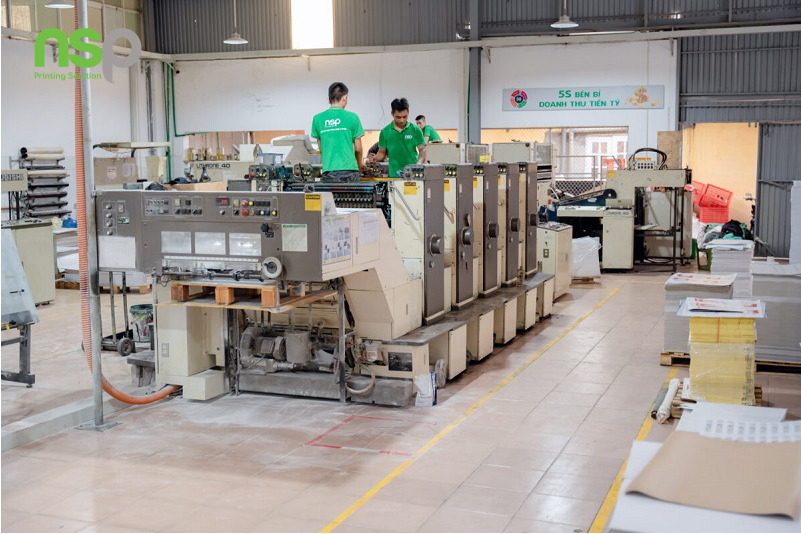 Sau khi mẫu thiết kế được duyệt, In NSP sẽ chọn lựa các loại giấy và nguyên liệu phù hợp giá thành khách hàng yêu cầu để in ấn. Công nghệ in offset hoặc in kỹ thuật số sẽ được áp dụng tùy thuộc vào số lượng yêu cầu của khách hàng. Số lượng ít thì NSP tư vấn in kỹ thuật số, số lượng nhiều sẽ in Offset để có giá thành rẻ. - Gia công và hoàn thiện